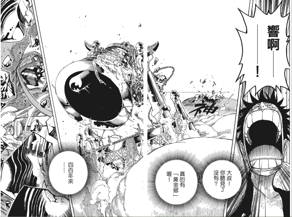 空島篇初期的劇情顯得有些混亂,神艾涅爾、空島居民、香迪亞與草帽團各方混戰,讓人一頭霧水。不過後來透過一本看似荒謬的童話故事,將諾蘭德一族對黃金鄉的追尋、香迪亞居民對故土的執著,以及空島上長達400年綿延不斷的紛爭全部巧妙地結合在一起,最後再透過黃金鐘的響亮鐘聲為400年的爭鬥畫下句點,相當震撼人心,實在不得不佩服尾田精湛的說故事能力。